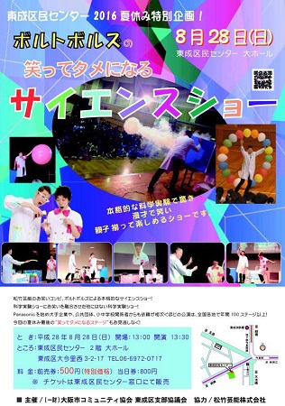 平井の友人のボルトボルズ(松竹芸能)が東成区でサイエンスショーを行います。